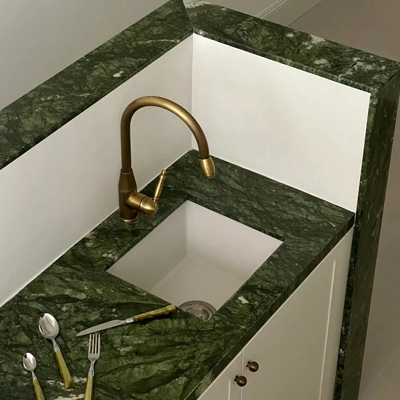 Ming Green Marble Countertops bring a rich but revitalizing look for kitchens. This marble complements nicely with white, grey, and wood cabinets, ancing the elegance and warmth of the kitchen.