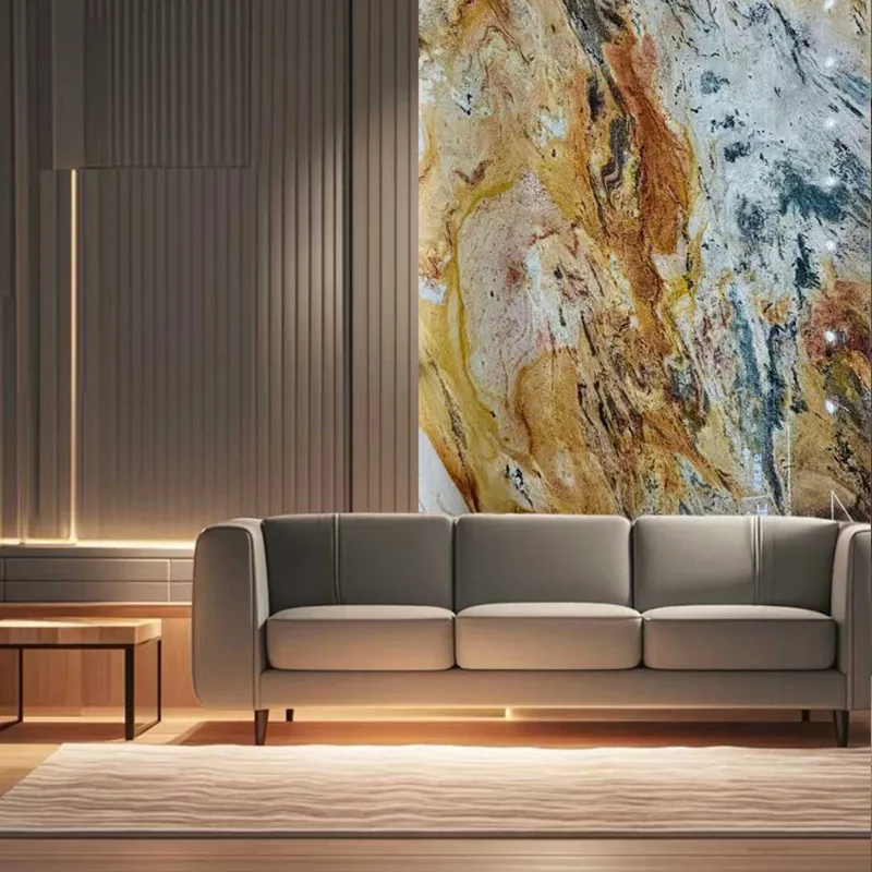 Picasso Quartziteスラブは、貴重なブラジルの贅沢な石です。この石は、劇的で複雑で豊かな色の1つですが、高品質です。この特定の石はユニークで、各スラブは独自の詳細と複製不可能です。