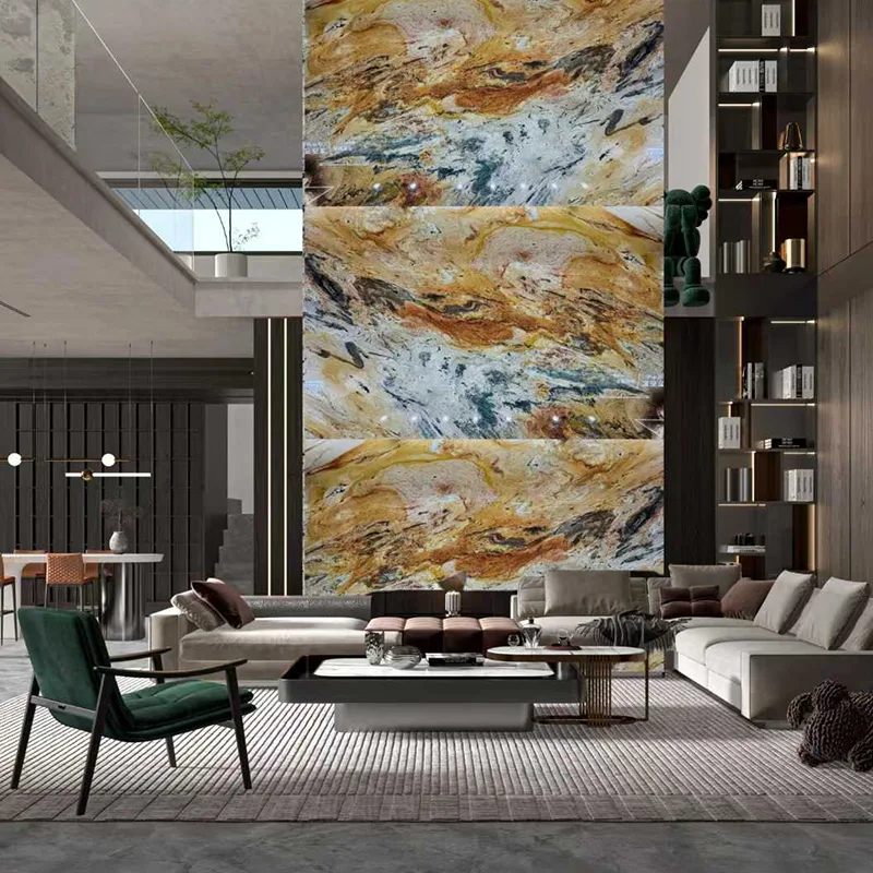 ピカソゴールドの石英は、ユニークなクォーツサイトパターンのために、豪華なクォーツのカウンタートップ、壁、床に求められています。ピカソゴールドのマルチカラーパレットは、現代的またはクラシックなデザインと楽に調和しています。焦点としてクォーツのダイニングテーブルを想像してください。すべての食事はギャラリーイベントになります。